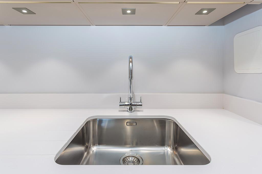 The kitchen was designed and made in Germany, appliances are Neff and AEG. Integral dishwasher and fridge/ freezer, pull out larder cupboard, Blanco Zeus silestone worktops and a stainless steel sink.
